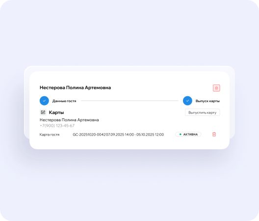 Выпуск, блокировка, переиспользование карт персонала и гостей, гибкие сценарии доступа