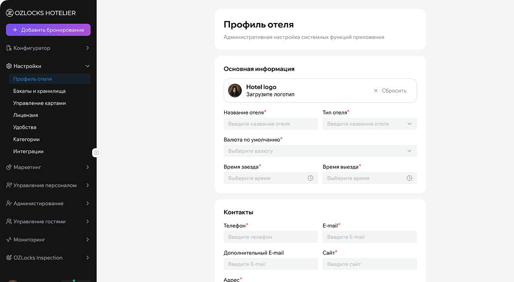 Территории, здания, этажи, категории и типы комнат — гибкая модель объекта, которая ложится на реальную структуру отеля
